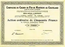 Share of the Compagnie du Chemin de fer de Martigny au Châtelard, issued February 1923