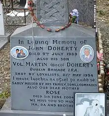 An inquest into Doherty's death in November 2004 returned a verdict of unlawful killing by person or persons unknown.[13] In 2006 a Garda superintendent stated the investigation into Doherty's death was ongoing, and that "We still have an unsolved murder and the file remains open. To date, no one has been made amenable".[14] Doherty's family believe the Irish authorities are withholding key information about the case, and are demanding answers from the Irish government.[14] Sinn Féin justice spokesman Aengus Ó Snodaigh pledged to raise this issue with the Minister for Justice, Equality and Law Reform, stating "Clearly the Irish government has very serious questions to answer about the ability of unionist death squads, led frequently by British agents, to attack and target Irish citizens with apparent impunity in this jurisdiction".[14] Doherty is regarded as a martyr by Irish republicans, with the Clonakilty cumann of Sinn Féin and the Martin Doherty Republican Flute Band named after him.[15][16] An annual commemoration march from the Dick McKee memorial in Finglas village to nearby Glasnevin Cemetery takes place each year.[10][17]