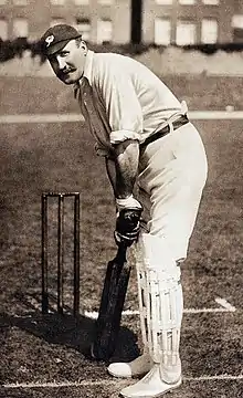Swanton wrote that, by 1900, Hawke had "moulded Yorkshire into the finest side in the country" and they won the County Championship three years in succession from 1900 to 1902. They were "essentially a complete team" with the batting of Tunnicliffe, Brown and David Denton; the powerful all-round play of Hirst, Rhodes and Schofield Haigh; and, crucially given Test calls, "plentiful reserves of high quality".[53] According to Kilburn, Hawke came to the "fulfilment of his cricketing ambitions" with the three successive titles which were "a logical culmination to ten years of cultivation".[54] Hawke's own batting was variable during these three seasons. He had little success in 1900 but scored 902 runs and 7 half-centuries in 1901; and then 565 runs with 2 centuries and no half-centuries in 1902.[40] His 1902 centuries were 107 not out for MCC against Oxford University and 126 for Yorkshire against Surrey.[34]
