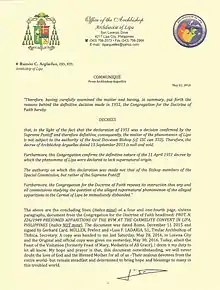Initially declared as "non-supernatural" after an investigation by six Filipino bishops headed by Cardinal Rufino Santos on 11 April 1951, the case was reopened in 1991 by the local bishop. On 12 September 2015, the Archbishop of Lipa Ramón Argüelles, against explicit direction from the Holy See and the Bishops' Conference of the Philippines, formally approved the apparitions, declaring them "supernatural in character and worthy of belief." In response, the Congregation of the Doctrine of the Faith, on 11 December 2015, declared the apparition non-supernatural.[1][3] The Archbishop of Lipa received the official copy on May 31 of final verdict. On 1 June 2016, Archbishop Arguelles released a public statement retracting his episcopal judgment on the controversial matter, reverting to the decision issued by the Holy See.
