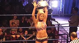 In early 2010, a tournament was held for the newly vacated WWE Divas Championship due to Melina's injury.[46] Maryse entered the tournament, and defeated Brie Bella and Eve Torres in the first round and semi-finals, respectively, to advance to the finals.[47][48] The tournament's finals were originally scheduled for Elimination Chamber on February 21; instead, the match was changed by the SmackDown General Manager Vickie Guerrero to an interbrand tag team match, where Maryse teamed with her scheduled opponent Gail Kim against LayCool (Michelle McCool and Layla), which was won by LayCool as a result of Maryse abandoning Kim during the match.[49][50] The following night on Raw, Maryse defeated Kim in the finals to win the championship, becoming the first Diva to have held it twice.[12][51]