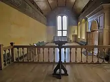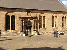The buildings that formed the backdrop for the events of the baptism are still intact with few external changes since 1594. The interiors of the Great Hall, Chapel Royal, and Palace have been returned to their original layout and proportions, and subdivisions made during the later use of the castle as army barracks removed. The rooms in the palace were restored in 2010.[81] Painted decoration surviving in the Chapel Royal by Valentine Jenkin mostly dates from 1629 and shadow traces of paintwork from 1594 can be seen on the exterior around the windows.[82] No furnishings from 1594 are known to survive, except a plain oak pulpit possibly used by Patrick Galloway and David Cunningham, which is stored by Historic Environment Scotland.[83]