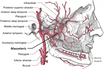![]() Plan of branches of internal maxillary artery. (Masseteric visible at bottom center.) | |