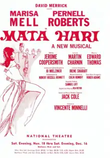 Mata Hari is a musical with a book by Jerome Coopersmith, lyrics by Martin Charnin and music by Edward Thomas. The exotic dancer Mata Hari was accused of spying for the Germans during World War I and was executed by a French firing squad, but her guilt is still being debated.[1] The musical is centered on her fictional affair with a French intelligence officer who plays a major role in her arrest and execution and later regrets it. A parallel sequence of events follows a young French soldier who fights in the trenches, illustrating what war is really about. The musical was perceived as an anti-war piece at a time when the US war in Vietnam was sinking in popularity.