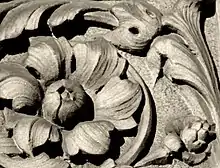 This is a Grade II* listed building,[65] designed by George Corson and opened on 16 April 1884.[66] Matthew Taylor may have been responsible for the lion-dog carvings on the interior stair rail, bearing in mind his interest in wildlife at Leeds Naturalists' Field Club,[67] his presence with Benjamin Burstall at Bolton Town Hall when an unidentified predator escaped into the rafters there,[68] and Matthew's signature portrait near the roof above those carvings.[69] The exterior carving was executed by Matthew Taylor and Benjamin Payler.[70]