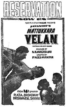 Mattukkara Velan (transl. Velan, the cowherd) is a 1970 Indian Tamil-language drama film directed by Pa. Neelakandhan. It is a remake of the 1966 Kannada film Emme Thammanna which was earlier remade in Telugu in 1968 as Govula Gopanna and in Hindi in 1969 as Jigri Dost.[1] The film stars M. G. Ramachandran, Jayalalithaa and Lakshmi, while S. A. Ashokan was the villain. It is a Silver Jubilee movie in Chennai, Madurai and Kovai and 100 days in all major cities of Tamil Nadu.