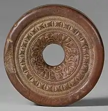 The ringstone is a distinctive type of artefact and miniature sculpture made in India during the approximate period of the Mauryan Empire and the following Sunga Empire (187-78 BCE). They are usually dated to the 3rd or 2nd centuries BCE.[12] They are shaped like a doughnut, but with straighter sides, and flat and plain on the bottom. They are in stone, with the top side very finely carved in relief with several circular zones of decoration running around the hole in the centre. When complete, they are about 2.5 to 4 inches across.[13]
