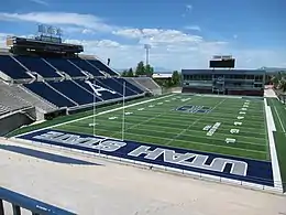 Maverik Stadium, also known as Merlin Olsen Field at Maverik Stadium, is an outdoor college football stadium in the western United States, on the campus of Utah State University in Logan, Utah. The home field of the Utah State Aggies of the Mountain West Conference, it opened 53 years ago in 1968 as "Romney Stadium" and currently has a seating capacity of 25,100. Its field has a traditional north-south alignment, and sits at an elevation of 4,710 feet (1,435 m) above sea level. The playing surface was natural grass through 2003, and is currently AstroTurf GameDay Grass.
