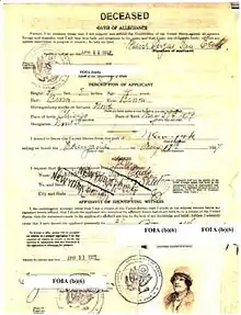 The Baroness died in New York City on March 10, 1937.[4] Her death certificate identified her as May de Pallandt van Eerde[4] and the cause of death was noted as cancer. The newspaper death notice listed her as beloved wife Marie of Edward Allen Morrisey, who worked for the Zanuck Movie Company.[4] She is buried in Gate of Heaven Cemetery, Hawthorne, Westchester County, New York.[25]