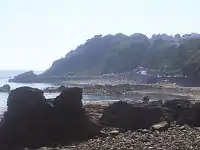 Meadfoot beach is a mixture of rock, stone and sandy areas. At the rocky eastern end there is a cliff and a car park, which gives access to a boat launching ramp. The western end is more sandy and has facilities such as a cafe and beach huts.[1] Beyond the beach, the road is adjacent to a cliff and there are parking spaces along the bottom of this. It is a common sight to see people fishing from the rocks. It is generally known as a local's beach due to its location away from the more popular tourist areas of Babbacombe and Torre Abbey. The Osbourne hotel overlooks the beach. Meadfoot beach has won the prestigious European blue flag award for the quality of its water. There are new 2 storey beach huts at one end, that cost to build in excess of £1,600,000.[2]
