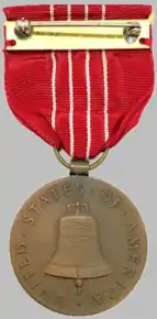 The medal is a bronze disc whose obverse features the profile of the Statue of Freedom of the US Capitol Building, with the word "FREEDOM" in capital letters in an arc at the bottom of the disc. The reverse features the Liberty Bell surrounded by the words "UNITED STATES OF AMERICA" in capital letters. The medal is suspended on a red ribbon with four thin white stripes. The original Executive Order 9586 establishing the medal specified "No more than one Medal of Freedom shall be awarded to any one person, but for a subsequent act or service justifying such an award a suitable device may be awarded to be worn with the medal"[3] and bronze, silver, and gold palm devices were produced and awarded. There is no evidence of U.S. citizens having received these palm devices, whereas some non-U.S. citizens did receive them (e.g. Micheline "Michou" Dumon and Nancy Wake), and these devices have been interpreted as signifying degrees of the award.[4][5]