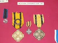 The Medal of Military Merit (Greek: Μετάλλιο Στρατιωτικής Αξίας) is a military decoration of Greece. It was originally created in 1916 for wartime meritorious service, but post-World War II became a peace-time medal reserved for officers. After the abolition of the Greek monarchy in 1974, its design was slightly altered.