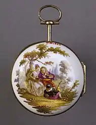 Böttger's experimental wares rapidly gained quality but never achieved successful painted and fired decor. The first successful ornaments were gold decorations applied upon the fired body and finely engraved before they received a second firing at a lower temperature. The lacy frameworks outside painted scenes known in German as Laub- und bandelwerk in red, gold or puce, were often used.[8] Augustus II charged first Johann Jakob Irminger with the design of new vessels. In 1720 Johann Gregor Herold became the director and in 1723 introduced brilliant overglaze colours that made Meissen porcelain famous, with an increasingly broad palette of colors that marked the beginning of the classic phase of Meissen porcelain. His enamel paints are still the basis for ceramic paints today. Initially painting mostly imitated the oriental designs known from Chinese and Japanese export porcelain, but some European landscape scenes were painted from early on.[9]