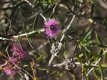 The flowers are a shade of pink to purple and arranged in heads or short spikes on the ends of branches which continue to grow after flowering, sometimes also in the upper leaf axils. The heads are up to 15 mm (0.6 in) in diameter and contain between 5 and 12 groups of flowers in threes. The stamens are arranged in bundles of five around the flower, with 4 to 7 stamens in each bundle. The flowering season is September and October and is followed by fruit which are woody capsules, 2–3.5 mm (0.08–0.1 in) long in an almost spherical cluster around the stems.[1][2]