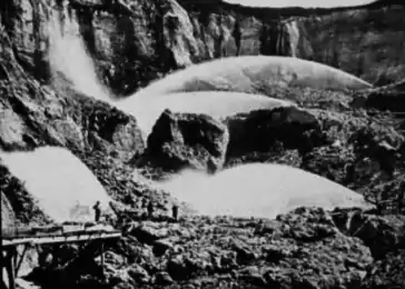 Gold was easily extracted from the rivers, by scooping and silling the river soil and gravel. The bottom trawler method was also developed to extract more gold at once. This was the pulling of metal baskets and rakes across the river beds to stir up gold, and scoop out gravel that was rich in gold. It was later, when the gold in the river bed wasn't as plentiful, that new mining techniques were being developed to extract gold more efficiently from the ground.[2] One of the main, and also most destructive methods was that of hydraulic mining. This involved the redirecting of water from the river into a narrow channel, into a large canvas hose, and iron nozzle. Then these water canons which were called monitors it would shoot a very high pressure stream that would break apart hillsides. The water, slurry, and debris, mostly gravel would flow over large sluices and drainage tunnels.[3] This was also when mercury was beginning to be used to help extract the gold from the masses of ore and silt.[2]