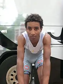 Merhawi Kudus Ghebremedhin (Tigrinya: መርሃዊ ቕዱስን ገብረመድኅን; born January 23, 1994) is an Eritrean cyclist, who currently rides for UCI WorldTeam Astana–Premier Tech.[4] He was named in the start list for the 2015 Tour de France,[5] becoming one of the first two black Africans to start the Tour alongside teammate and countryman Daniel Teklehaimanot.[6] At the age of 21 Kudus was the youngest rider in the race.[7] He was named in the start list for the 2016 Giro d'Italia.[8]