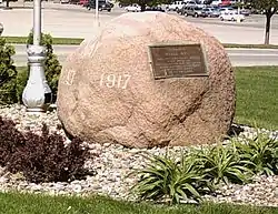 When the United States entered the First World War, Hay was young enough to avoid being drafted. With his father's blessing, he voluntarily enlisted on May 9, 1917.[3] He was among 8 men from Glidden who enlisted that day. They were first shipped to Fort Logan, Colorado, then to Fort Bliss in El Paso, Texas.[2] He was assigned to the 16th Infantry Regiment. On 26 June 1917, the regiment disembarked the troop ships in St. Nazaire, France, as part of the 1st Infantry Division. By November 1917, he was assigned to Company F along with Corporal James Bethel Gresham and Private Thomas Enright. They were posted in the trenches near the French village of Artois. In the early morning of 3 November 1917, the Imperial German Army attacked. After an hour of fighting, Hay, along with Corporal Gresham, and Private Enright were the first three casualties of the American Expeditionary Force.[4]