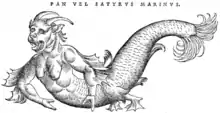 Konrad Gesner in his chapter on Triton (mythology) in Historia animalium IV (1558) gave the name of "sea-Pan" or "sea-satyr" (Latin: Pan- vel satyrus marinus) to an artist's image he obtained, which he said was that of an "ichthyocentaur" or "sea-devil".[13][lower-alpha 4][14][15]