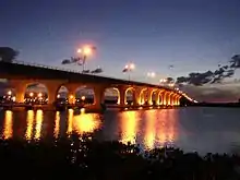 The Merrill P. Barber Bridge is a concrete arch bridge that spans the Indian River Intracoastal Waterway in Indian River County, Florida. The bridge was built by Odebrecht Contractors of Florida, Inc. and was completed in 1995. A fishing pier is constructed below the bridge on the east side.