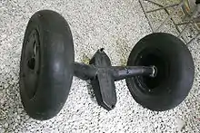 During testing of the prototype (A-series) aircraft, the jettisonable undercarriage presented a serious problem. The original dollies possessed well-sprung independent suspension for each wheel,[17] and as the aircraft took off, the large springs rebounded and threw the dolly upward, striking the aircraft. The production (B-series) aircraft used much simpler, crossbeam-axled dollies, and relied on the landing skid's oleo-pneumatic strut[18] to absorb ground-running impacts during the takeoff run, as well as to absorb the shock of landing. If the hydraulic cylinder was malfunctioning, or the skid mistakenly left during a landing procedure in the "locked and lowered" position (as it had to be for takeoff), the impact of a hard touchdown on the skid could cause back injuries to the pilot.[19]
