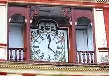The "Methan Mani" is located near the Padmanabha Swamy Temple in Thiruvananthapuram.[3] To see it, one has to stand before the temple entrance and look in the opposite direction of the Padmatheertha pond. It is on the top of the Old Fort Palace. The unique feature of the clock is the presence of a bearded man on top of the dial who opens his mouth corresponding to every hour and two rams hit his cheek and forcing him to close his mouth. This action is co-oridnated with the hourly chimes.