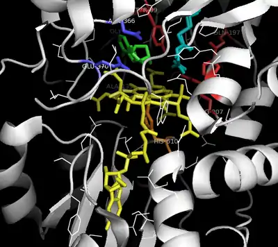 Other important residues of methylmalonyl-CoA mutase include Histidine-244, which acts as a general acid near the substrate and shields the radical species from side reactions involving oxygen,[20] Glutamate-370, whose hydrogen bond with the 2’-OH group of the ribose of the β-axial ligand forces interaction between the β-axial ligand radical species and the substrate,[21] and tyrosine-89 which stabilizes reactive radical intermediates and accounts for the stereo-selectivity of the enzyme.[18][22]
