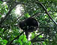 The Mexican howler (Alouatta palliata mexicana) is a subspecies of the mantled howler, A. palliata. This subspecies is found predominantly in forests between south eastern Mexico and north eastern Peru.[3] Typical of its species, the Mexican howler monkey has a prehensile tail, a deep jaw, and a large pharynx which it uses to make characteristically deep and resonating howls.[4] Mantled howler monkeys are known for forming unusually large cohorts averaging 14 members and sometimes extending to 40 members.[4]