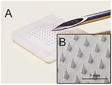 Microneedles are microscopic applicators used to deliver vaccines or other drugs across various barriers: while transdermal application is the most popular use of microneedles, intraocular and intracochlear microneedle drug delivery systems are emerging. [2] [3] Microneedles are constructed through various methods usually involving photolithographic processes or micromolding.[4] These methods involve etching microscopic structure into resin or silicon in order to cast microneedles. Microneedles are made from a variety of material ranging from silicon, titanium, stainless steel, and polymers.[5][1] Some microneedles are made of a drug to be delivered to the body but are shaped into a needle so they will penetrate the skin. The microneedles range in size, shape, and function but are all used as an alternative to other delivery methods like the conventional hypodermic needle or other injection apparatus.