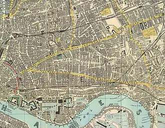 Middlesex outside the metropolitan area remained largely rural until the middle of the 19th century and so the special boards of local government for various metropolitan areas were late in developing. Other than the Cities of London and Westminster, there were no ancient boroughs.[30] The importance of the hundred courts declined, and such local administration as there was divided between "county business" conducted by the justices of the peace meeting in quarter sessions, and the local matters dealt with by parish vestries. As the suburbs of London spread into the area, unplanned development and outbreaks of cholera forced the creation of local boards and poor law unions to help govern most areas; in a few cases parishes appointed improvement commissioners.[31] In rural areas, parishes began to be grouped for different administrative purposes. From 1875 these local bodies were designated as urban or rural sanitary districts.[32]