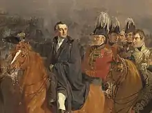 On the restoration of Ferdinand, Álava was cast into prison, but the influence of his uncle Ethenard, the Inquisitor, and of Wellington secured his speedy release. He soon contrived to gain the favour of the King, who appointed him ambassador to The Hague in 1815. As a result of this, he was present at the Battle of Waterloo with Wellington's staff.[3] Álava stuck close to the Duke during the Battle. Like Wellington, and unlike many of his staff, Álava survived the battle without sustaining any wound although Wellington and his staff were in the thick of the action, with the Duke declaring to Alava: "The hand of Almighty God has been upon me this day".[5] Álava is presumed to have been the only man on the Coalition side who was present at both Waterloo and Trafalgar.[3] [lower-alpha 1]