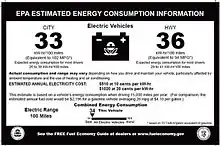 The MPGe metric was introduced in November 2010 by EPA in the Monroney sticker of the Nissan Leaf electric car and the Chevrolet Volt plug-in hybrid. The ratings are based on EPA's formula, in which 33.7 kilowatt-hours (121 megajoules) of electricity is equivalent to one (U.S.) gallon of gasoline,[8] and the energy consumption of each vehicle during EPA's five standard drive cycle tests simulating varying driving conditions.[9][10] All new cars and light-duty trucks sold in the U.S. are required to have this label showing the EPA's estimate of fuel economy of the vehicle.[3]