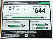 In November 2010 the EPA began including "MPGe" in its new sticker for fuel economy and environmental comparisons. The EPA rated the Nissan Leaf electric car with a combined fuel economy of 99 MPGe,[9] and rated the Chevrolet Volt plug-in hybrid with a combined fuel economy of 93 MPGe in all-electric mode, 37 MPG when operating with gasoline only, and an overall fuel economy rating of 60 mpg-US (3.9 L/100 km) combining power from electricity and gasoline.[10][44][46] For both vehicles EPA calculated the MPGe rating under its five-cycle tests using the formula displayed earlier with a conversion factor of 33.7 kW-h of electricity being the energy equivalent of a gallon of gasoline.[10]