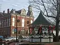 Officially designated Union Square, the Milford Oval is neither square nor oval in shape, but rather triangular. The "square" name in American parlance denotes a town common irrespective of geometry, and the "oval" name dates from the 19th century, when it was oval in shape. The Oval is the town center, with the Pillsbury Bandstand as its centerpiece and the Souhegan River as backdrop. The Oval is formed by a modified traffic rotary in which State Highways 13 and 101A intersect, with northbound 13 and eastbound 101A passing straight through and crossing each other at a right angle with a stop sign for traffic on Route 13. For many years, the Oval's traffic flow was treated as a series of three individual intersections of three one-way streets, resulting in the unusual arrangement whereby vehicles entering the Oval had right-of-way over vehicles turning left to continue through the Oval. This treatment was reversed in the 1980s to conform with traffic rotary norms whereby vehicles already in the Oval have right-of-way over vehicles entering the Oval.