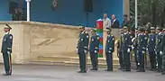 The combined band of the service (usually 170-members) have taken part in the parades in honor of the 90th, 93rd, 95th, and 100th anniversary of the Azerbaijani Armed Forces as well as organized performances in various parts of Baku on the Day of the Armed Forces of Azerbaijan.[15][16] In June 2017, the Band of the Defense Ministry performed with the Salamanca Band of the Rifles at the Azerbaijan State Philharmonic Hall.[17] In September 2018, it performed for presidents Ilham Aliyev and Recep Tayyip Erdogan in honor of the 100th anniversary of the Liberation of Baku. At around the same time, a CD was released by the Exemplary Band that includes a number of military marches performed by the band and its soloists.[8] In August 2019, the higher military academy band took part in the Spasskaya Tower Military Music Festival and Tattoo, representing Azerbaijan for the first time.[18]