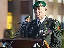 In all service branches, the beret is "bashed" to the right, and a badge or insignia is worn above the left eye. In the army, all units can wear them, with certain units wearing unique ones.[9] In the navy, the beret is an optional item,[10] and in the air force, it is only worn by certain units.[11]