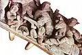 17th century wood relief showing arquebusier alongside mounted archer. Hương Canh Communal house.