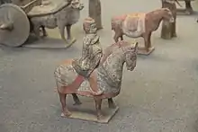 Armies of the Three Kingdoms era used largely the same equipment as the Han dynasty since it directly follows the end of the Han. There were however some minor differences and developments such as the increasing prevalence of armoured cavalry. In one battle, the warlord Cao Cao boasted that with only ten sets of horse armour he had faced an enemy with three hundred sets.[18] The horse armour may however have just been partial frontal barding.[15] Mounting stirrups were already in use, possibly as early as the Han dynasty, but full riding stirrups would not appear until the 4th century.[19] References to "dark armour" (xuan kai or xuan jia 玄鎧/玄甲) and "brilliant armour" also began to appear in the 3rd century. This is probably in reference to the association of high quality steel with black ferrous material.[20]