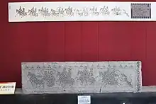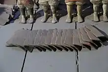 It's clear from surviving inventory lists in Gansu and Xinjiang that the crossbow was greatly favored by the Han dynasty. For example, in one batch of slips there are only two mentions of bows, but thirty mentions of crossbows.[34] Crossbows were mass-produced using material such as mulberry wood and brass; a crossbow in 1068 could pierce a tree at 140 paces.[35] Crossbows were used in numbers as large as 50,000 starting from the Qin dynasty and upwards of several hundred thousand during the Han.[36] According to one authority the crossbow had become "nothing less than the standard weapon of the Han armies" by the second century BC.[37] Han era carved stone images and paintings also contain images of horsemen wielding crossbows. Han soldiers were required to pull an "entry level" crossbow with a draw-weight of 76 kg to qualify as a crossbowman.[38]
