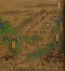 Princes of the Imperial family were also granted substantial military authority in strategic points around the empire. Each was granted an estate with the power to recruit military officers for their personal staff (this was restricted in 1395) and held total judicial authority over them. This ancient system, intended to provide military experience before deployment, had not been used in China for a thousand years.[39] Princes were also dispatched to join campaigns with their personal bodyguards. Zhu Di, Prince of Yan, impressed the Hongwu Emperor with his command of the 1390 campaign against the Mongols under Nayir Bukha and was allowed to retain command of the 10,000 Mongol soldiers he had captured. This later aided the prince in his usurpation of the throne. In some cases the princes were appointed to fill vacant command positions. Zhu Gang, the Prince of Qin, was sent to build military colonies (tuntian) beyond the Great Wall.[40] Princes were granted an escort guard (hu-wei ping) under their personal control, while a court-appointed officer commanded the shou-chen ping or garrison force, over which the princes only had authority during emergencies declared by the Emperor. This dual chain of command was meant to prevent a coup d'etat in the capital. The garrison force could only be deployed with an order carrying both the Emperor's and the Prince's seal. The Regional Military Commission armies were then used to check the princes' military power. Many princes amassed large bodyguard forces and transferred regular soldiers to their personal command without authorisation anyway, using them on campaign.[41] The authority of princes was curtailed by the Jianwen Emperor. When the Yongle Emperor came to power, he further purged his brothers on trumped up charges and abolished most of the princely guards; by the dynasty's end there were less than a dozen extant. He also established a hereditary military nobility from his top generals during his usurpation, both Han Chinese and Mongol. They were however denied long-term commands so as to prevent personal power bases from forming.[42]