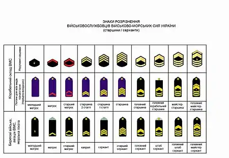 | Master Gunnery Sergeant Chief master sergeant Головний майстер-сержант | Senior Master Sergeant Старший майстер-сержант | Master Sergeant Майстер-сержант | Sergeant First Class Штаб-сержант | Gunnery Sergeant Technical Sergeant Головний сержант | Staff Sergeant Старший сержант | Sergeant Сержант | Junior sergeant Молодший сержант | Private first class Airman first class Старший матрос | Private Airman Матрос | |||||||||||||||||||||||||||
