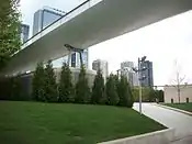 The pedestrian bridge serves as a noise barrier for the pavilion, blocking traffic sounds from Columbus Drive. It is a connecting link between Millennium Park and destinations to the east, such as the nearby lakefront, other parts of Grant Park and a parking garage.[20] The BP Bridge uses a concealed box girder design with a concrete base, and its deck is covered by hardwood floor boards.[135] It is designed without handrails, using stainless steel parapets instead.[133] The total length is 935 feet (285 m), with a five percent slope on its inclined surfaces that makes it barrier-free and accessible.[136][137] It has won awards for its use of sheet metal.[138][139] Although the bridge is closed in winter because ice cannot be safely removed from its wooden walkway, it has received favorable reviews for its design and aesthetics.[60]