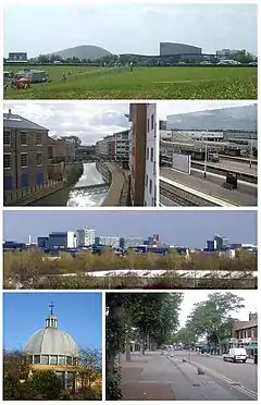 ![]() Top to bottom, left to right: The Xscape and Theatre seen from Campbell Park; former railway works and new housing in Wolverton; Milton Keynes Central railway station; the Central Milton Keynes skyline; the central ecumenical Church of Christ the Cornerstone; and Bletchley's high street "Queensway". | |