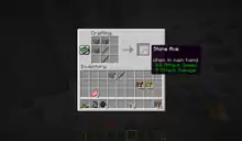 Players can craft a wide variety of items in Minecraft.[44] Craftable items include armor, which mitigates damage from attacks; weapons (such as swords or axes), which allows monsters and animals to be killed more easily; and tools, which break certain types of blocks more quickly. Some items have multiple tiers depending on the material used to craft them, with higher-tier items being more effective and durable. Players can construct furnaces, which can cook food, process ores, and convert materials into other materials.[45] Players may also exchange goods with a villager (NPC) through a trading system, which involves trading emeralds for different goods and vice versa.[46][35]