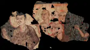 This Romanesque style is thought to be the work of a Buddhist painter known as "Titus" (𐨟𐨁𐨟, Tita), who signed his painting at Miran with his name in Indian Kharoshti characters, and who was perhaps a Roman artist who traveled east along the Silk Roads in search of employment.[10][11][12] Several artefacts have been found at the Miran site, including bows and arrows.[13]