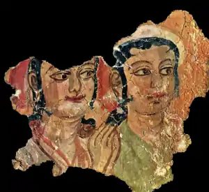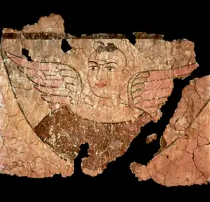 The ruins at Miran consist of a large rectangular fort, a monastery ('the Vihara' in Stein's accounts), several stupas and many sun-dried brick constructions, located relatively close to the ancient caravan track to Dunhuang, running west to east. The many artifacts found in Miran demonstrate the extensive and sophisticated trade connections these ancient towns had with places as far away as the Mediterranean Sea. Archaeological evidence from Miran shows the influence of Buddhism on artistic work as early as the first century BC.[7] Early Buddhist sculptures and murals excavated from the site show stylistic similarities to the traditions of Central Asia and North India[8] and other artistic aspects of the paintings found there suggest that Miran had a direct connection with Rome and its provinces.[9]