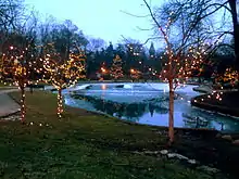 Mirror Lake is a pond on the campus of The Ohio State University in Columbus, Ohio. Historically, the lake was spring-fed, and sat on the property of William Neil in North Columbus (then a city of its own, which would later be annexed by Columbus). The trustees in charge of purchasing land for the new Ohio Agricultural and Mechanical College (which would later become the Ohio State University) chose to purchase Mr. Neil's land after drinking from the spring. A German trustee reportedly stated "It's hard to get a Dutchman away from a spring like that." The spring dried up in 1891 when the city of Columbus struck the source of the spring while installing a trunk sewer line through campus. The water source was subsequently provided by the city of Columbus municipal water supply, at a new location on campus near the location of the original lake. Visitors, students, faculty, and staff enjoy the fountains that run in spring, summer, and autumn.