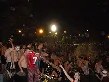 The Mirror Lake Jump event is not a university sponsored event, and people are encouraged not to participate by The Ohio State University.[7] Although the event has been associated with a variety of emergency room visits, and loss or destruction of property, folklore exists that calls it the "Lucky Mirror Lake Jump" event. There are OSU graduates who have jumped into Mirror Lake according to tradition who have become very wealthy and have had wonderful lives. Of course, at least one person has been paralyzed from an injury associated with Mirror Lake, and another person has died, although neither was directly related to the Mirror Lake Jump event.[8][9] One man did die in 2015 after being pulled out of the lake [10] The 2010 Mirror Lake Jump was associated with approximately 25 trips to the emergency room for cuts, sprains, and other injuries.[11] The 2004 Mirror Lake Jump was associated with at least three injuries.[8] A study was conducted during one of the Mirror Lake Jumps where water samples were taken from the lake throughout the night. It was noteworthy that the ammonia levels in the lake greatly increased throughout the night. This has been attributed to people urinating in the lake.[12] There has also been concern that the lake may be a potential source for disease infection, salmonella is a concern.[8] The Ohio State University usually spends approximately $20,000.00 cleaning up the landscape and property surrounding Mirror Lake after the jump event.[8][13] Jumping into Mirror Lake is also a fourth-degree misdemeanor, however police acknowledge that they ignore this during jump events in order to focus on the safety of those present.[14]