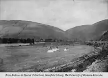 The Missoula area was first settled in 1858 by William T. Hamilton with a trading post near current Missoula along the Rattlesnake Creek, by Captain Richard Grant, who settled near Grant Creek, and by David Pattee, who settled near Pattee Canyon.[10] Missoula was founded in 1860 as Hellgate Trading Post while still part of Washington Territory. By 1866, the settlement had moved east, 5 miles (8 km) upstream, and had been renamed Missoula Mills, later shortened to Missoula.[11] The mills provided supplies to western settlers traveling along the Mullan Road. The establishment of Fort Missoula in 1877 to protect settlers further stabilized the economy. The arrival of the Northern Pacific Railway in 1883 brought rapid growth and the maturation of the local lumber industry. In 1893, the Montana Legislature chose Missoula as the site for the state's first university. Along with the U.S. Forest Service headquarters founded in 1908, lumber and the university remained the basis of the local economy for the next 100 years.[12]