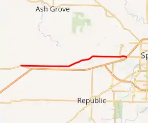 Route 266 starts at its intersection of Missouri Route 96 1.5 miles (2.4 km) west of I-44.[2] At Halltown, the Route meets Route Z. In 12.5 miles (20.1 km), Route 266 deviates from old Route 66 in a project to improve access to Springfield-Branson Regional Airport. For 1 mile (1.6 km), the route follows the new roadway. At the Partial cloverleaf interchange at Interstate 44, the road continues as Interstate 44 Business.
