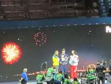 In her first long course world championship meet at the 2011 World Aquatics Championships in Shanghai, Franklin won a total of five medals, three gold, one silver, and one bronze. In her first event, the 4×100-meter freestyle relay, Franklin won a silver medal with Natalie Coughlin, Jessica Hardy and Dana Vollmer in a time of 3:34.47. Swimming the second leg, Franklin had a split of 52.99, the second-best among all participants.[30] Franklin won her first individual medal, a bronze, in the 50-meter backstroke, finishing behind Russian Anastasia Zuyeva and Japanese Aya Terakawa.[31] Shortly after the 50-meter backstroke final, Franklin competed in the 4×200-meter freestyle relay with Dagny Knutson, Katie Hoff and Allison Schmitt and won gold ahead of Australia and China in a time of 7:46.14. Franklin's lead-off time of 1:55.06 was faster than the winning time of Italian Federica Pellegrini in the individual 200-meter freestyle final (1:55.58).[32] After setting the national record in the semi-finals of the 200-meter backstroke (2:05.90), Franklin dominated the field in the final with a time of 2:05.10, breaking her own national record and winning gold. This was Franklin's first individual world title, and her time in the final was the third-fastest effort of all time.[33] Shortly after the 200-meter backstroke final, Franklin competed in the 4×100-meter medley relay with Natalie Coughlin, Rebecca Soni, and Dana Vollmer and won gold with a time of 3:52.36, over three seconds ahead of second-place finisher China. Swimming the freestyle leg, Franklin had a split of 52.79, the fastest in the field. The final time of 3:52.36 for the medley relay was the second-fastest effort of all time, just behind the Chinese-owned world record of 3:52.19.[34] For her performance at these championships, she won the Female Athlete of the Year, Female Race of the Year (200-meter backstroke), and the Relay Performance of the Year (4×100-meter medley relay) Award at the eighth annual Golden Goggle Awards.[35] She was also named the best female swimmer for 2011 by FINA Aquatics World Magazine.[36]